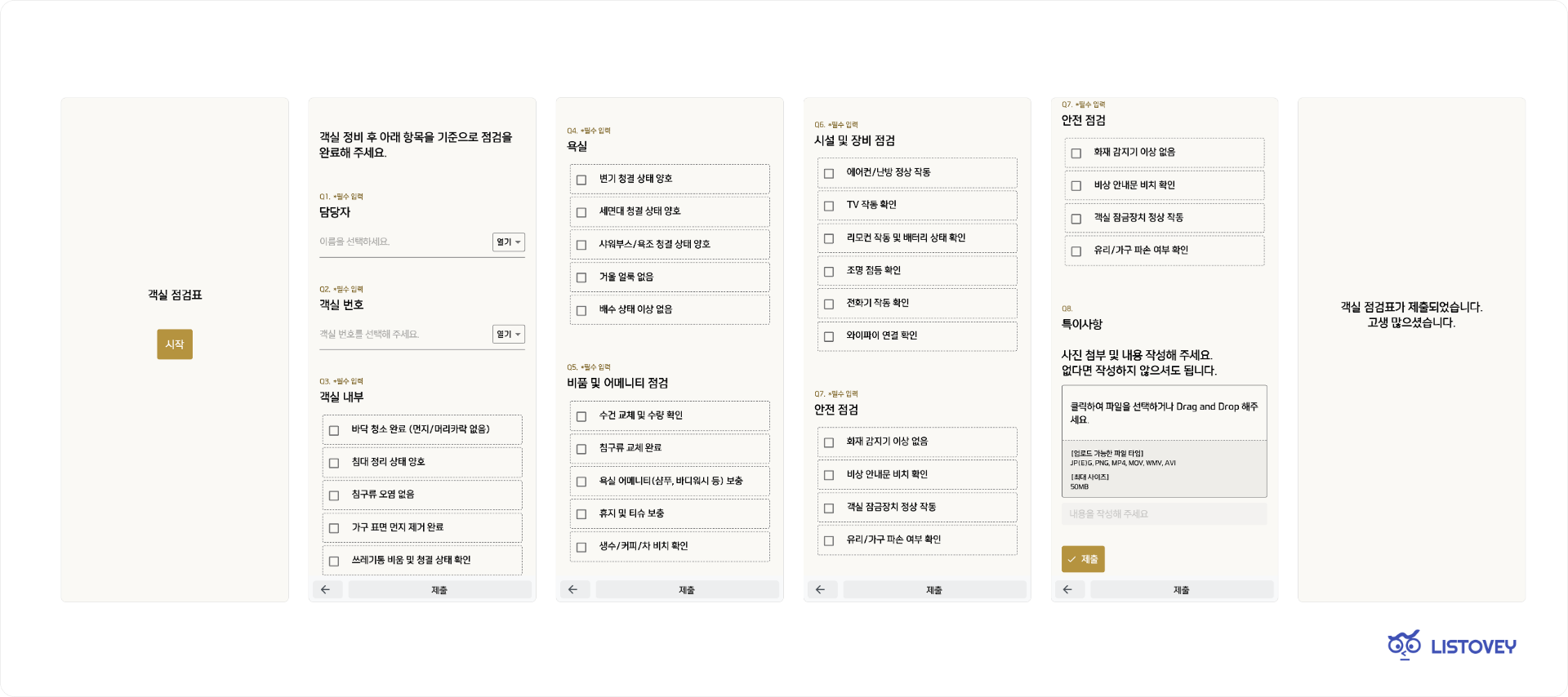 기존에는 객실 점검 내용을 종이에 작성하거나 별도로 정리해야 했지만, 이를 설문 형태로 전환해 하나의 흐름으로 관리했습니다. 담당자 이름, 객실 번호, 작업 리스트를 체크하는 방식으로 구성해, 점검 후 바로 제출할 수 있도록 했습니다.