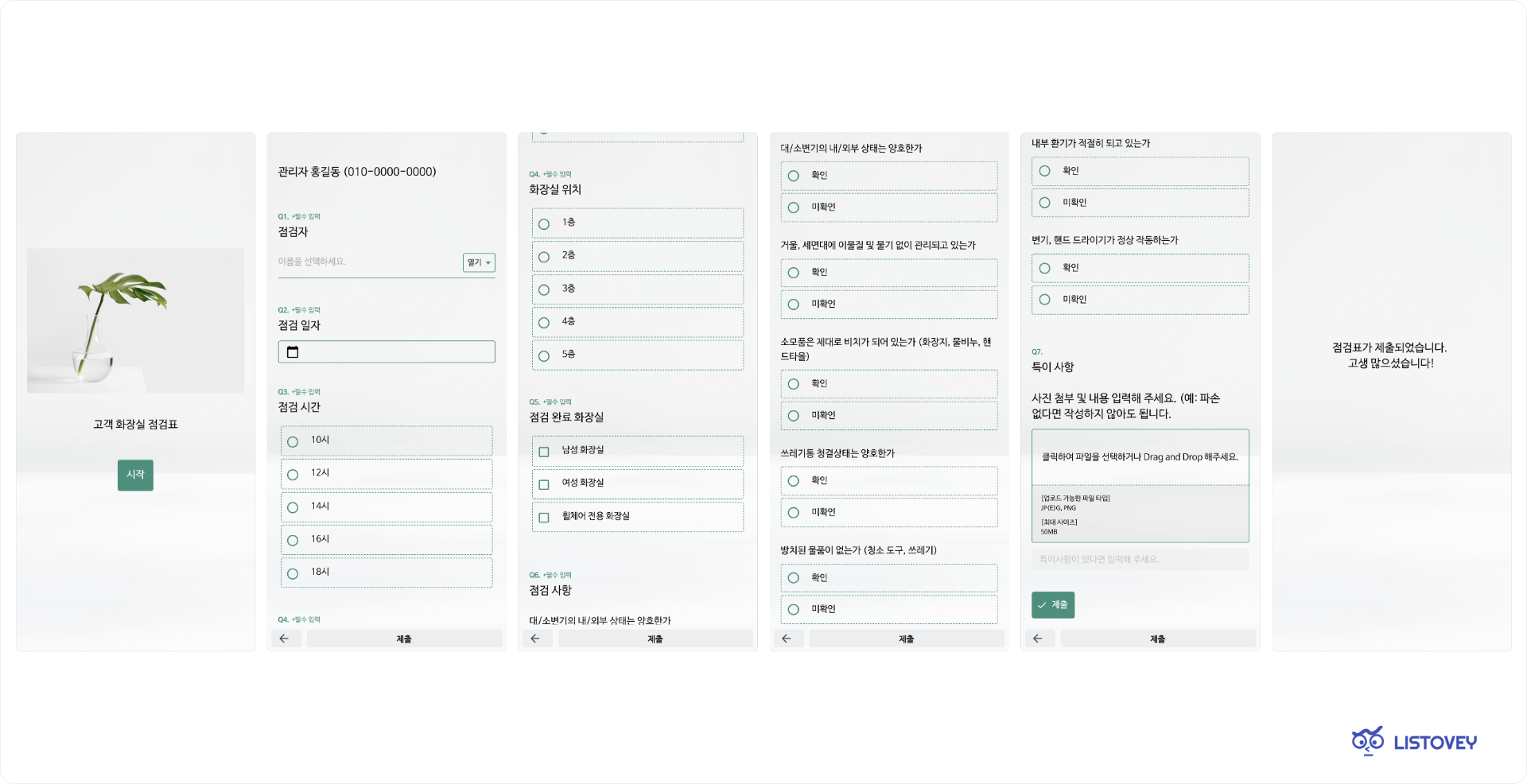 공중화장실과 같은 공용 공간 점검 역시 설문으로 전환했습니다. 벽에 수기로 작성하던 점검표 대신, 모바일로 매일 점검 내역을 입력하고 제출할 수 있도록 했습니다. 기록 누락을 줄이고, 관리자는 언제든 점검 현황을 확인할 수 있어 운영 안정성이 높아졌습니다.