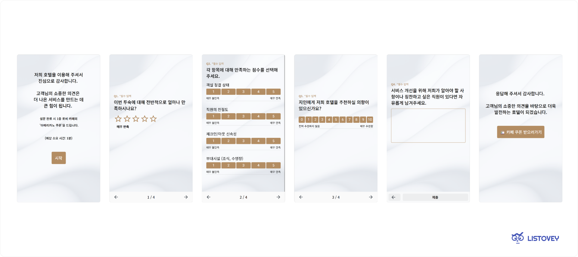 내부 운영뿐 아니라, 투숙객을 대상으로 한 이벤트나 만족도 조사에도 설문을 활용했습니다. 체크아웃 이후 간단한 설문을 통해 고객 경험을 수집하고, 서비스 개선에 반영할 수 있는 구조를 만들었습니다.