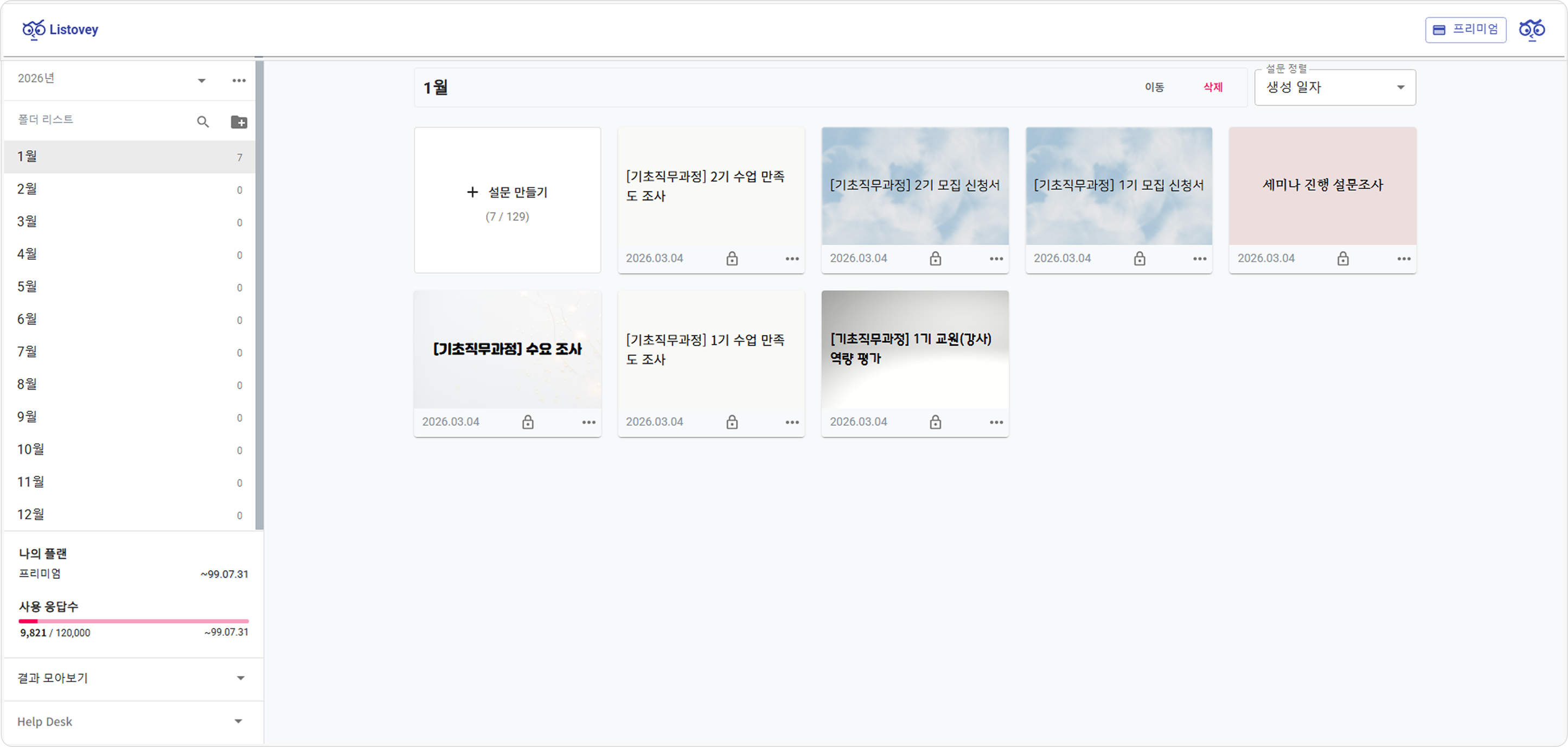 설문은 누적될수록 관리 방식이 중요해집니다. 이 기관은 연간·월간 단위로 폴더를 구성해 설문을 정리했습니다. 예를 들어, 연도별 상위 폴더를 만들고 그 안에 월별 또는 프로젝트별 폴더를 생성해 수요조사, 사전 설문, 사후 설문을 함께 묶어 관리했습니다.