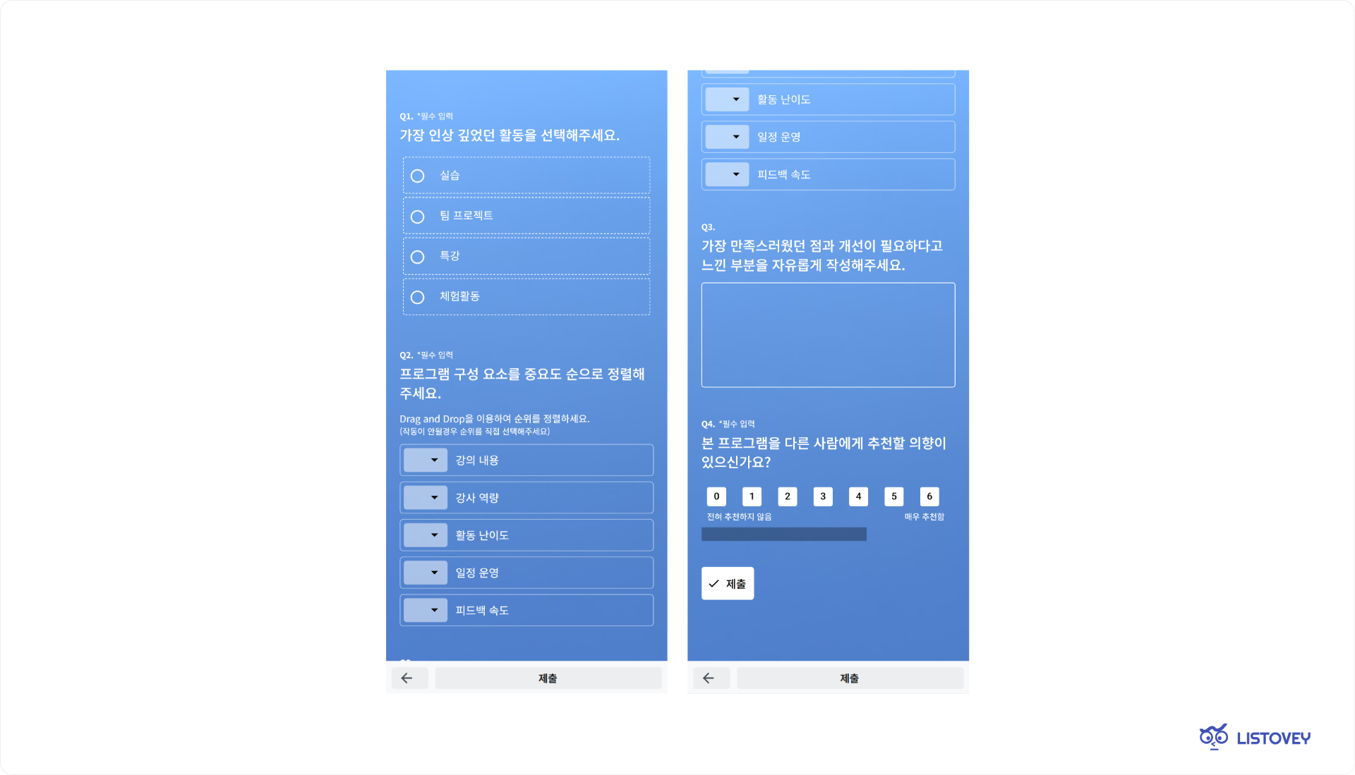 리스토베이를 이용한 이후, 결과 설문 제작과 데이터 정리에 쓰이던 시간이 크게 줄었습니다. 외주 없이 내부에서 빠르게 설문을 운영할 수 있게 되었고, 누적된 수요조사와 교육 피드백 데이터를 기반으로 프로그램 성과를 비교할 수 있게 되었습니다. 이제 설문은 단순한 운영 업무가 아니라, 다음 프로젝트를 준비하는 기획 데이터로 활용되고 있습니다.
