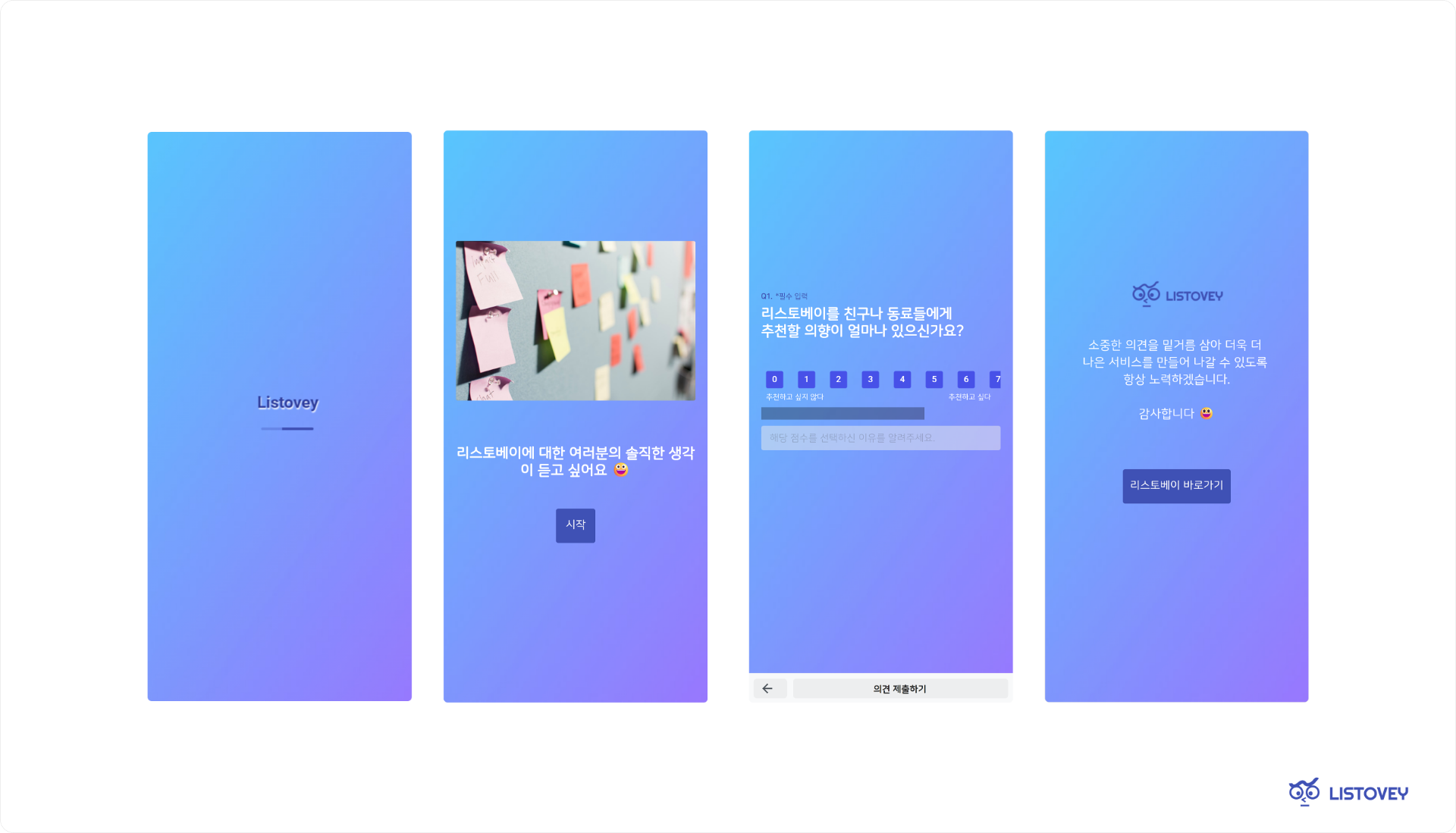 고객이 서비스를 일정 기간 이용한 이후에는 NPS 설문을 통해 실제 경험에 대한 만족도와 추천 의향을 수집했습니다. 단순 만족도뿐 아니라, 어떤 점이 긍정적이었는지, 어떤 부분에서 불편을 느꼈는지 구체적인 피드백도 함께 확인할 수 있도록 구성했습니다.