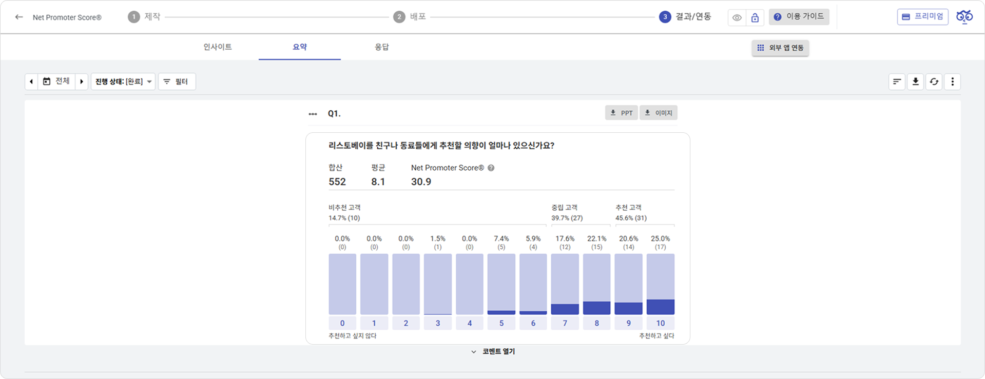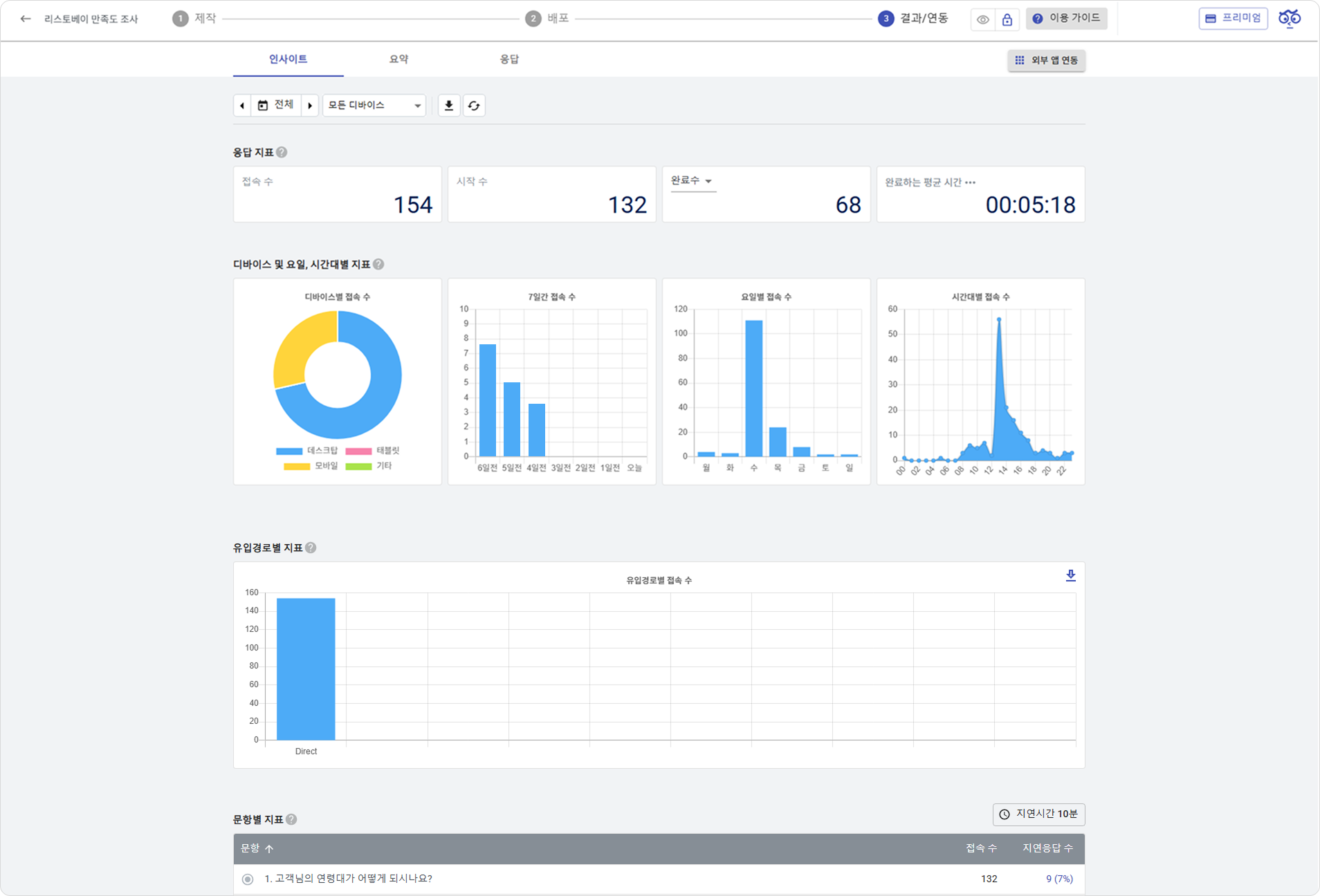 이 통신사는 인사이트 페이지를 활용해 설문 데이터를 실시간으로 모니터링했습니다. 응답이 수집되는 즉시 데이터가 업데이트되기 때문에, 현재 진행 상황을 빠르게 파악하고 필요한 조치를 바로 취할 수 있었습니다.